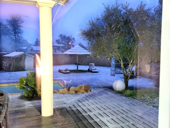 Belle maison lumineuse et harmonieuse composée d’une vaste pièce de vie ouverte sur terrasse et piscine 3 chambres, dont 2 suites avec salle d’eau privative, une grande véranda de 27 m2 avec vue sur la nature