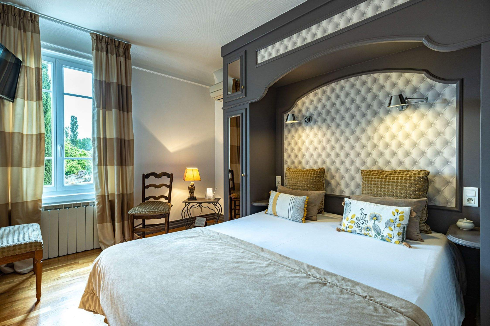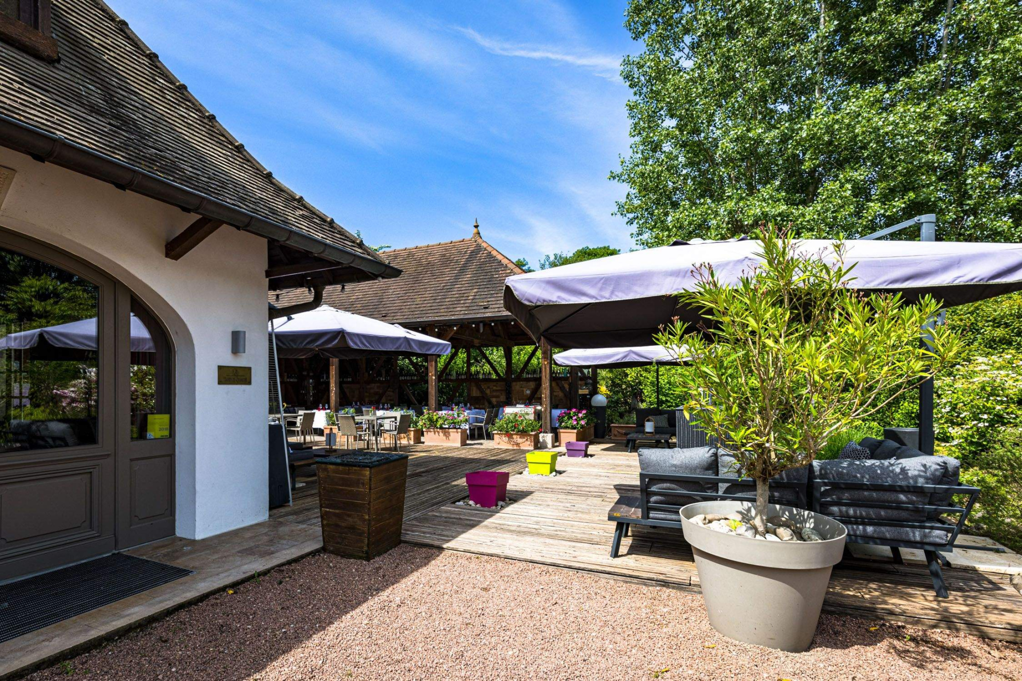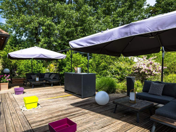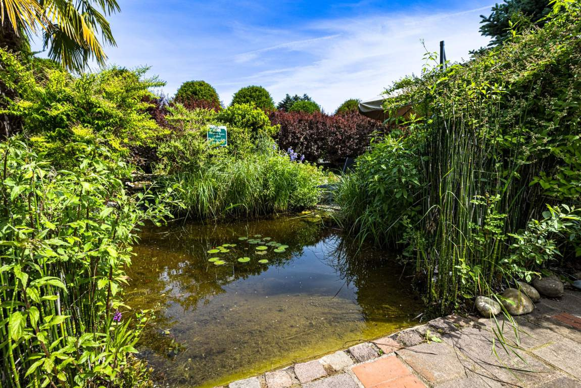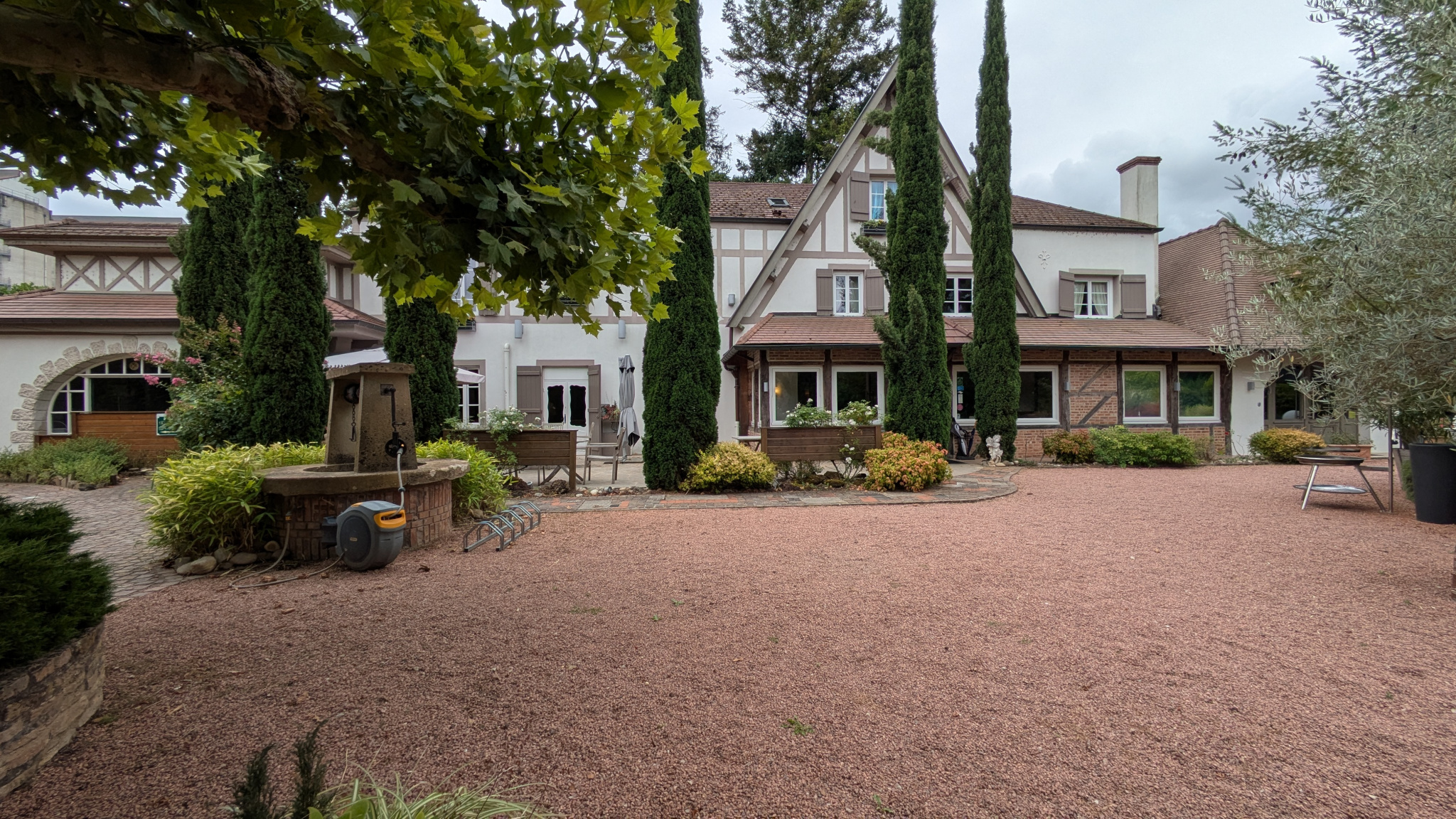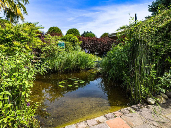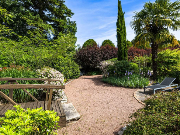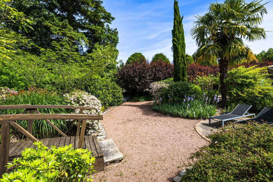Extérieurs soignés sur un terrain de 3 400 m2 : Parc arboré et paysager, Terrain de pétanque, fontaine, coins détente