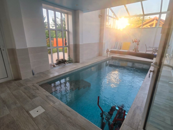 Cette maison est composée au RDC : Salle à manger cuisine équipée, espace réception (50m2) style lounge, piscine chauffée intérieure avec nage à contrecourant, Sauna. Salle d’eau, WC indépendant. Buanderie.